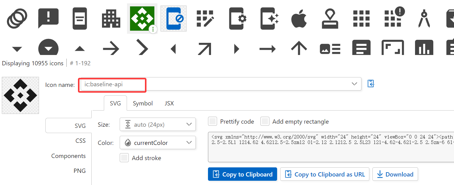 ### 图标 提供Icon组件。 位于==@/components/Icon==目录下。 图标可以分为三类:本地svg图标、远程图标、AntDesignVue图标。 ### 本地svg图标 将svg图标文件放在@/assets/icons目录下。  ```vue <icon icon="captcha|svg" /> ``` captcha是文件名,|svg是特定后缀。 ### 远程图标 远程图标使用的是iconify,[点此进入官网](https://icon-sets.iconify.design/) 选择图标后,如下图所示:  ```vue <icon icon="ic:baseline-api" /> ``` 直接将icon name填写在icon属性上即可。 >i **说明** > > 远程图标是在线下载图标的,并没有将远程图标打包在本地。 ### AntDesignVue图标 直接按照AntDeginVue文档使用图标即可。