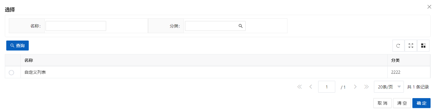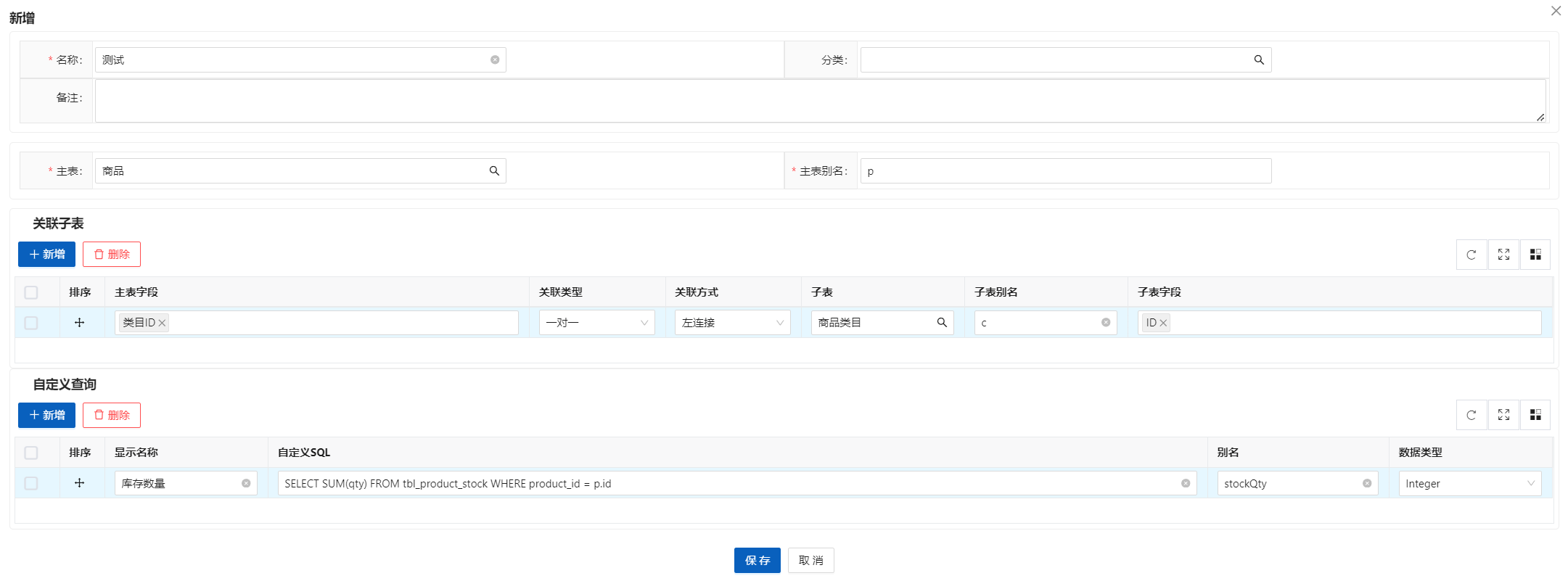 ### 代码生成 位于**com.lframework.starter.web.gen**包下。 这个包下包含controller、service等代码,对应**开发管理**菜单的数据实体、数据对象、自定义列表、自定义选择器、自定义页面功能。 这些功能的增删改查代码不再赘述,可自行查看源码。 #### 数据实体 表示数据库的单表。 ==数据实体不会自动创建数据库表,只是从数据库中加载一张表。== 针对数据实体可以生成代码,其中包含:新建菜单的SQL、mamper、service、controller、vo、bo、entity以及前端的增删改查页面。 ##### 生成静态代码 核心类是Generator。 位于**com.lframework.starter.web.gen.components.generate**包下。 Generator类是处理类,内部的逻辑是组装多个Template类,然后利用Template类渲染ftl模板文件,最终得到静态代码。 ##### Template类  controller层的代码就是用的ControllerTemplate,ftl模板用的是controler.java.ftl。其他的依次类推。 ##### ftl模板文件 位于web-starter的resources/templates目录中。  #### 数据对象 将多个数据实体join起来,即:表示的多表join。 举个例子:  主表和子表的概念都比较好理解。 上图这个例子中,最终得到的SQL就是: ```sql SELECT p.*, c.*, ( SELECT SUM( qty ) FROM tbl_product_stock WHERE product_id = p.id ) AS stockQty FROM base_data_product p LEFT JOIN base_data_product_category c ON c.id = p.category_id ``` #### 自定义列表 表示各个功能中最常见的列表,需要关联一个数据对象。 举个例子:  自定义列表加载出来就是上图中的这种列表。 配置功能比较简单,这里不再赘述。 #### 自定义选择器 表示常见的弹出框的选择器,需要关联一个自定义列表。 举个例子:  右侧这个组件就是一个选择器,点击后:  自定义选择器加载出来就是上图中的这种选择器。 配置功能比较简单,这里不再赘述。 #### 自定义页面 表示一整个页面。直白点说:就是将vue的代码保存在数据库中。 举个例子:  上图就是配置页面,页面代码就是写vue的template部分,脚本代码就是写script部分。