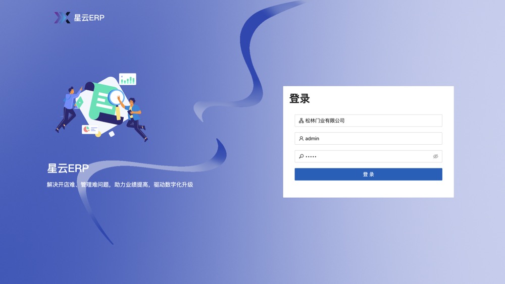 星云ERP系统采用B/S架构模式,可通过浏览器随时随地访问系统。下面介绍一下如何访问星云ERP系统。 在浏览器中打开星云ERP系统登录地址,进入到登录页面。  1. 录入:租户信息 在“登录”区域,第一横行展示“测试租户”,表示即将要进入到哪个租户系统中。在正式环境下,第一横行为“录入框”,需要登录者手动录入要访问的租户名称。 注:本截图为星云ERP系统的测试环境,第一横行默认为“测试租户”。 2. 录入:账号/密码 录入完“租户信息”后,再录入账号、密码。 3. 登录系统 点击“登录”按钮,系统会校验“租户信息、账号、密码”是否已录入。如果没有录入,对应的录入框会变为红色边框,并提示相应的信息,如“请输入用户名、请输入密码”。校验通过后,再录入验证码则进入系统。 **示例** “松林门店”想通过星云ERP系统管理自己的业务,星云研发人员已为该公司配置租户信息,且租户的名字为“松林门店有限公司”,则登录页面如下:  点击“登录”按钮,录入验证码则成功登录系统。
