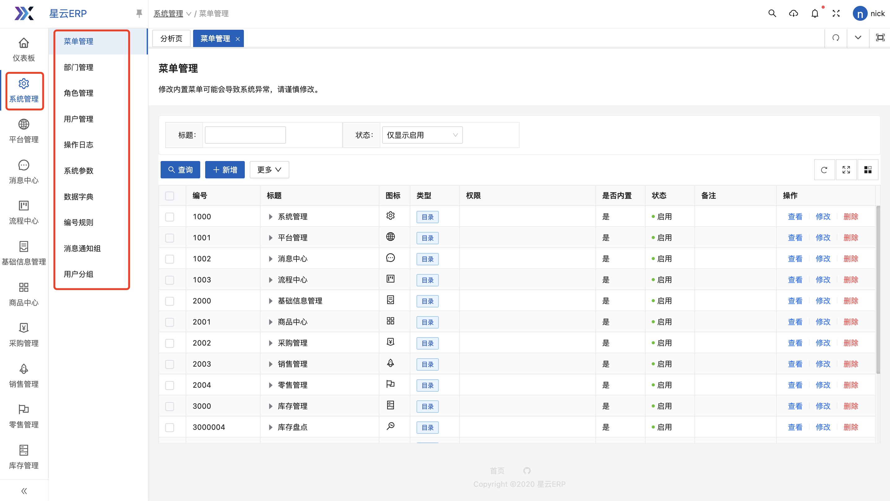 >s **星云ERP系统:系统管理** > > 本章节介绍星云ERP系统的“系统管理”模块。 星云ERP系统是企业管理软件,该模块可对系统进行基础管理,实现统一管理系统的结构和相关基础信息,同时,也会涉及很多企业管理方面的基础概念。  1. 本模块的用户 本模块建议由系统管理员或负责企业信息化的运维人员使用。 2. 本模块的使用场景 任何企业在使用系统前均需要通过本模块完成“部门、角色、用户”的配置,以及系统相关的基础配置。 **系统相关的基础概念** 1. 菜单 是指集中提供操作系统或应用程序核心功能、设置和管理选项的菜单。可以理解为:访问星云ERP系统核心功能、程序、设置和资源的主要入口。 如“仪表板”是星云ERP系统的一级菜单,光标点击后,可以看到“仪表板”下展开的二级功能菜单“分析页、工作台”,这两个功能菜单点击后,则进入到相应的功能页面。 2. 功能 是指系统中可执行的操作。 如星云ERP系统中的“商品分类、商品品牌、商品管理、新增、删除”等操作均为系统功能。 3. 功能权限 是指允许查看和使用的一系列的功能集合。可以理解为,功能权限解决的核心问题是:“谁”在星云ERP系统中“能做什么”? 如在星云ERP系统中将“采购订单管理、采购收货管理、采购退货管理”以及各功能中的操作组合在一起,叫做“采购权限”。 4. 数据权限 是指在使用某些功能时允许查看和操作的数据范围。可以理解为,数据权限解决的核心问题是:“谁”在星云ERP系统中”能对“哪些数据”执行操作? 如在星云ERP系统中将“某几个高端品牌的商品”组合在一起,叫做“高端商品组”。 5. 角色 是指在一个系统中将功能权限和数据权限组合在一起的身份名称。可以理解为,角色解决的核心问题是:“谁”在星云ERP系统中“能通过哪些功能”操作“哪些数据”? 如在星云ERP系统中将“采购权限和高端商品组”组合在一起,叫做“高端品采购经理”,拥有该角色的员工,则可对“高端品牌的商品”进行采购、退货等操作。 6. 用户 是指允许登录系统的“人”。可以理解为:系统的登录账号和密码。该账号和密码可被某一个人使用,也可被一类人使用。 如在星云ERP系统中创建“Purchasing Manager”账号,并指定角色为“高端品采购经理”,则该“用户”可通过账号密码进入系统完成该角色的业务。 **企业相关的基础概念** 1. 部门 是指在企业或组织中,为了实现特定目标、承担特定职能或完成一类相关任务,而形成的正式工作单元或管理单元。可以理解为:将具有相似技能、知识或工作内容的员工划分在一起形成的集合或管理单元。如企业或组织中常见的“财务部门、行政部门、人力部门”等。 2. 员工 员工是与企业签订正式劳动合同/雇佣协议,建立劳动法律关系,为企业提供劳动并获取报酬的自然人。可以理解为:为完成某些目标或任务而招聘的具体的人。如“为研发中心招聘的会JAVA的人、IOS开发的人”。 注:在招聘时,企业是面向所需的岗位进行人员的招聘,星云ERP系统目前弱化了岗位、员工的概念。通过“部门、角色、用户”实现企业架构和员工的管理,“部门”实现企业架构的管理,“用户”实现员工的管理,“角色”实现“用户”权限的管理。这样,在系统使用时更为简单、易上手。 接下来,对每个功能进行详细介绍。