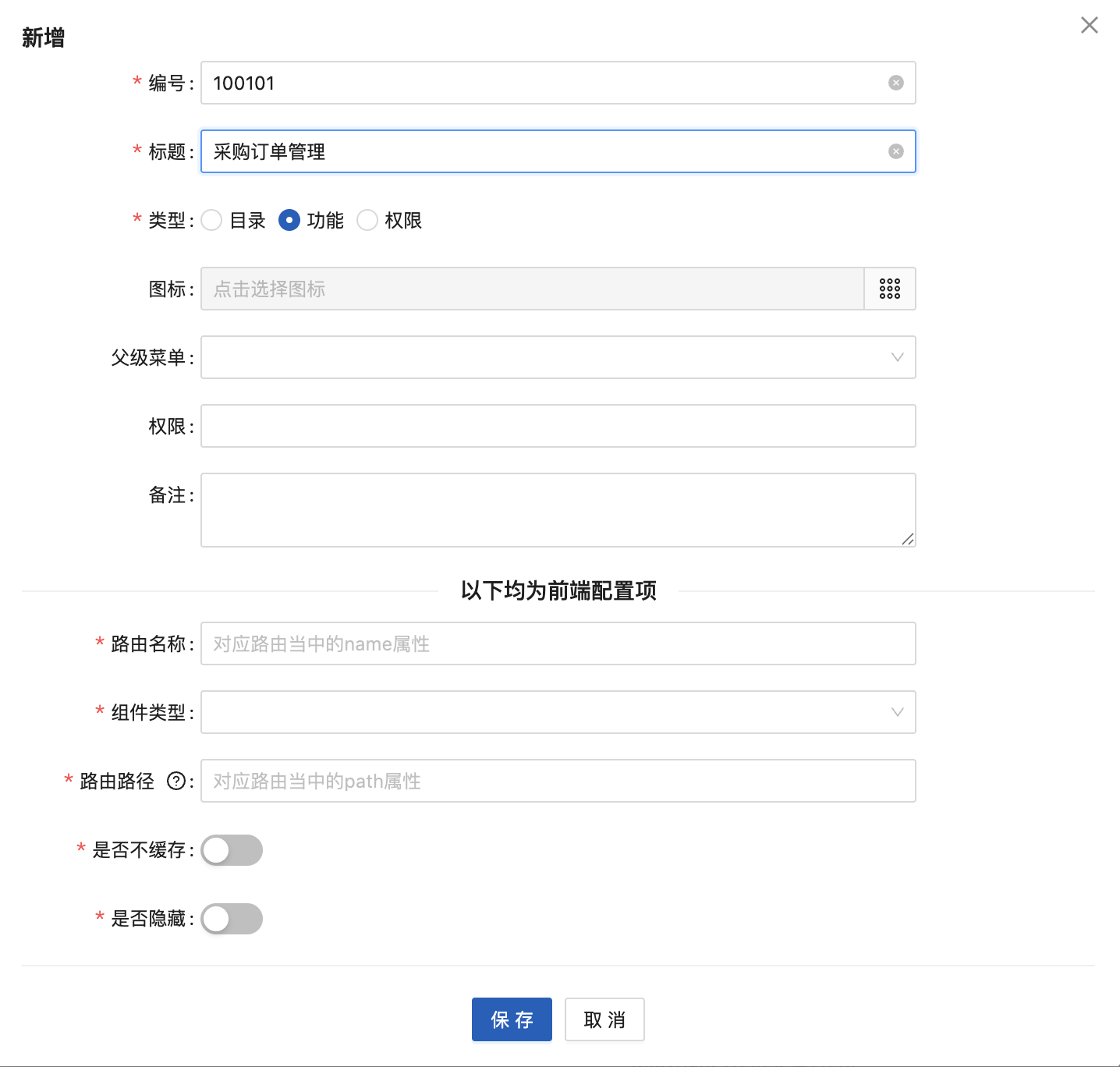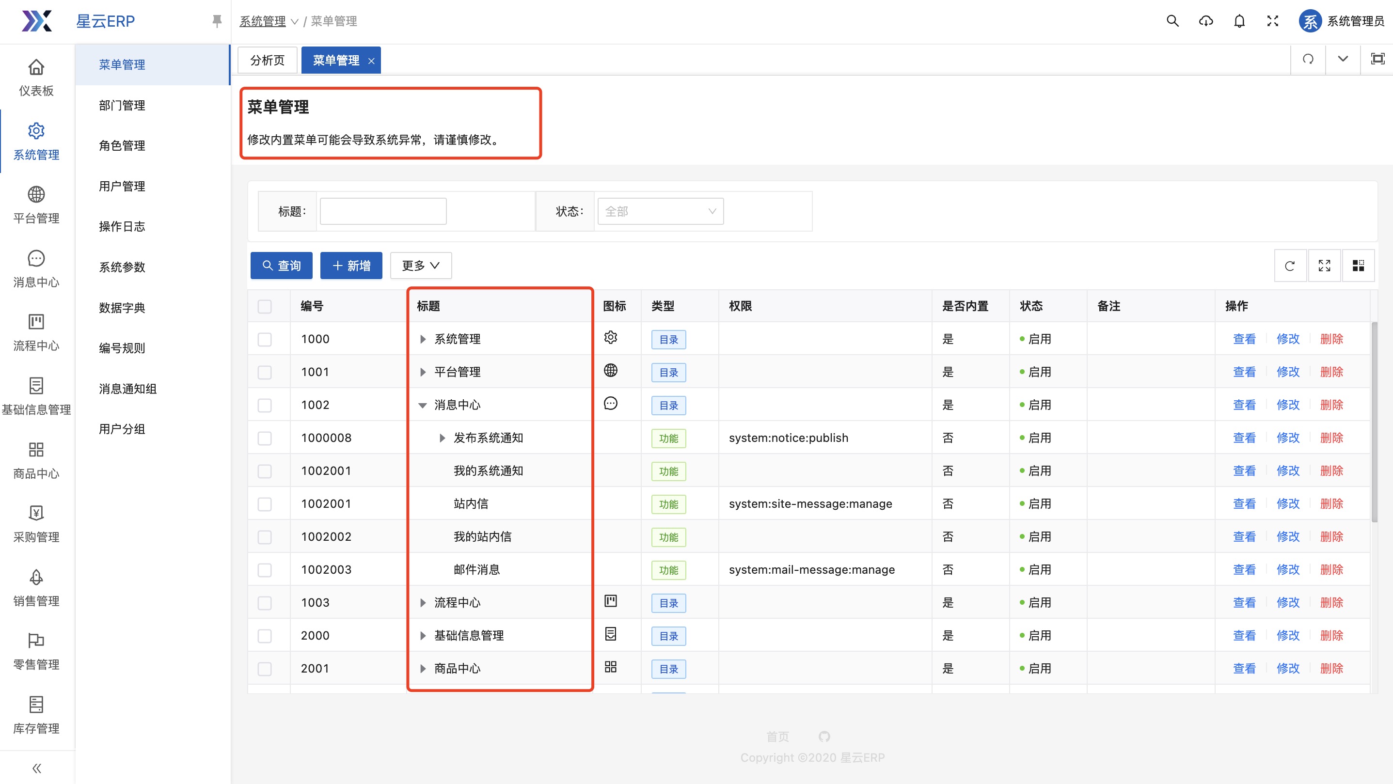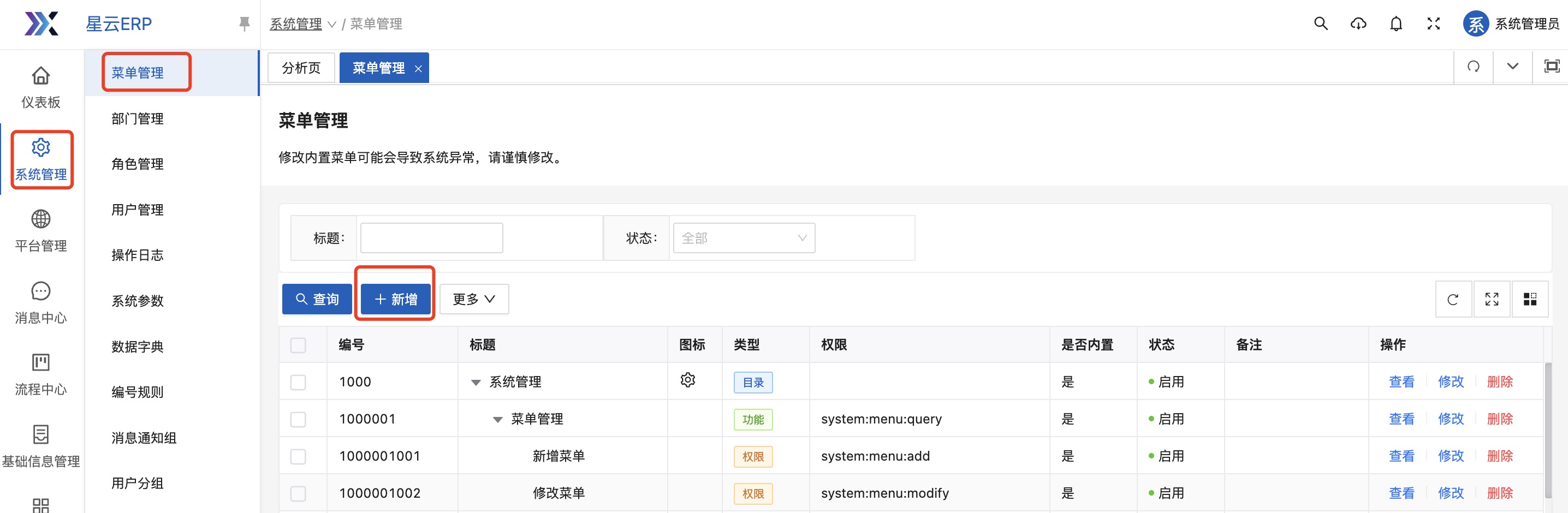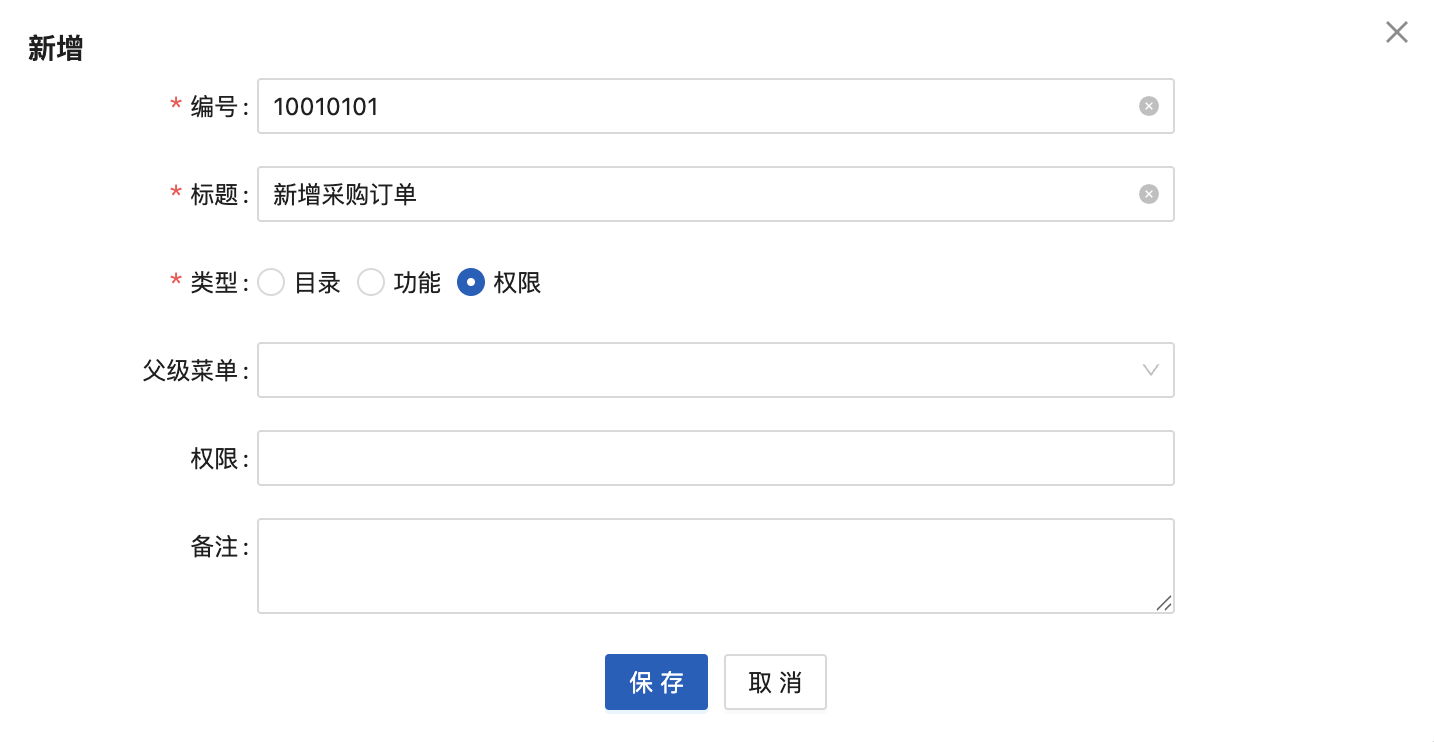 本功能用于设置星云ERP系统的“菜单”信息。 **菜单**是指集中提供操作系统或应用程序核心功能、设置和管理选项的菜单。 菜单可以是一个目录,也可以是一个具体的功能,同时,也可以是一个具体的操作。 **示例**  1. “系统管理”为一级菜单,类型为“目录”,点击后,展示该菜单的下级菜单列表。 2. “菜单管理”为二级菜单,类型为“功能”,点击后,系统打开“菜单管理”的页面,进一步可在该功能下进行具体的操作。 3. “新增”为操作按钮,类型为“权限”,点击后,系统打开“新增”弹窗,可进行新增“菜单”的操作。 可以看到,菜单分为多个类型,不同的类型对应不同的含义。星云ERP系统将菜单分为“目录、功能、权限”3个类型: 1. 类型为“目录” 是指该菜单为进入下级菜单的入口。如“系统管理”为“目录”类型的菜单,不是具体功能,更不执行具体的系统逻辑或业务场景,仅是作为入口。在菜单树形结构中,一般属于父级节点或一级节点。 2. 类型为“功能” 是指该菜单为具体业务功能或系统功能的入口,也可理解为:该菜单是为完成某个业务场景、系统逻辑的入口。如“菜单管理”为“功能”类型的菜单,是具体的系统功能,是要执行菜单管理业务的入口。在菜单树形结构中,属于末级以上的节点,但不是末级节点,因为,末级节点为类型为“权限”的菜单。 3. 类型为“权限” 是指该菜单为执行具体系统逻辑的入口,也可理解为:该菜单会执行具体的系统逻辑。如“新增”为“权限”类型的菜单,是具体的系统逻辑,执行后会为系统新增一个菜单。在菜单树形结构中,属于末级节点。 如图可以清晰得知,各类型菜单在整个菜单结构中的位置和作用。 **本功能使用场景** 修改系统已有菜单名称、菜单结构,以满足企业用户的使用习惯。或是新增菜单模块、新增功能,实现系统的快速开发,以满足企业新增业务的快速响应。 **本功能用户** 系统管理员或者具有开发能力的研发人员。 执行“菜单管理”功能时,可以看到,星云ERP系统中已“启用”的菜单结构(如下图所示):  ## 1.1新增 点击“新增”按钮,显示:  1. 编号:必填,唯一性。 2. 标题:菜单的名称,必填。 3. 类型:分为“目录、功能、权限”,根据新增菜单的应用场景进行勾选。 4. 父级菜单:菜单允许为多级,所以需要指定父级菜单或上级菜单。非必填,如果新增的菜单为一级菜单,则父级菜单不需要配置,如果新增的菜单为某一模块下的二级菜单或功能,则父级菜单需要配置,以实现正确的菜单结构。 5. 备注:菜单的补充说明信息。非必填。 **示例1** 新增“采购管理”模块,一级菜单为“采购管理”:  因为是一级菜单,且不是具体功能,不执行系统逻辑,仅为入口,所以类型为“目录”。 1. 图标:“采购管理”菜单前的小图标,不具有业务意义,以让系统看起来更美观。  2. 父级菜单:“采购管理”为一级菜单,因此不需要配置父级菜单。 3. 路由名称:对应路由当中的name属性。必填。 4. 路由路径:对应路由当中的path属性。如果需要内嵌iframe页面,那么此处填写值规则:路由地址/src=iframe地址,例如:/baidu?src=https://www.****.com 5. 是否隐藏:该菜单是否在系统中显示。 以上信息配置完毕后,点击“保存”按钮,即可完成“目录”类型的菜单新增。 **示例2** 在“采购管理”模块中,新增“采购订单管理”功能:  因为“采购订单管理”是要完成采购管理的业务,是具体功能,所以类型为“目录”。 1. 父级菜单:“采购订单管理”为“采购管理”下的二级菜单,因此需要配置父级菜单,且选择“采购管理”。 2. 权限:该菜单是否进行权限管理,如果管理,则需要配置为该菜单配置权限参数,以实现在“功能权限”配置时可以为用户进行授权此功能。 3. 路由名称:对应路由当中的name属性。必填。 4. 组件类型:分为“普通、自定义列表、自定义页面”。 (1)普通:表示是自己开发的组件。选择后,需要录入“组件”对应路由当中的component属性。  (2)自定义列表:表示是通过星云ERP系统“开发管理-自定义列表”配置出来的。选择后,需要选择一个“启用”状态的自定义列表。  (3)自定义页面:表示是通过星云ERP系统“开发管理-自定义页面”快速开发的页面。选择后,需要选择一个“启用”状态的自定义页面。  5. 路由路径:对应路由当中的path属性。如果需要内嵌iframe页面,那么此处填写值规则:路由地址/src=iframe地址,例如:/baidu?src=https://www.****.com 6. 是否不缓存:表示“采购订单管理”功能在切换页面是是否执行自动刷新操作。默认为“缓存”。可根据功能使用场景进行配置。 (1)如本功能为订单录入功能,在使用时经常遇到切换到其他功能查询数据等情况,因此,配置成“缓存”,这样避免在切换时自动刷新导致已录入未保存的数据自动清空。 (2)如本功能为参数配置功能,需要看到最新的配置信息,因此,切换页面需要自动刷新。因此,配置成“不缓存”。 7. 是否隐藏:该菜单是否在系统中显示。 以上信息配置完毕后,点击“保存”按钮,即可完成“功能”类型的菜单新增。 **示例3** 在“采购订单管理”功能中,增加“新增”操作:  因为“新增”操作是要进行采购订单录入,是具体的系统逻辑,所以类型为“权限”。 1. 父级菜单:“新增”为“采购订单管理”下的菜单,因此需要配置父级菜单,且选择“采购订单管理”。 2. 权限:该菜单是否进