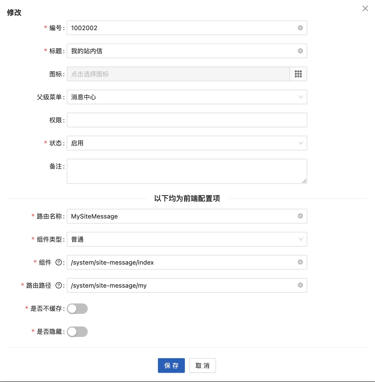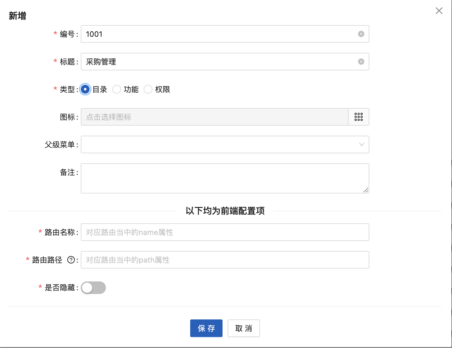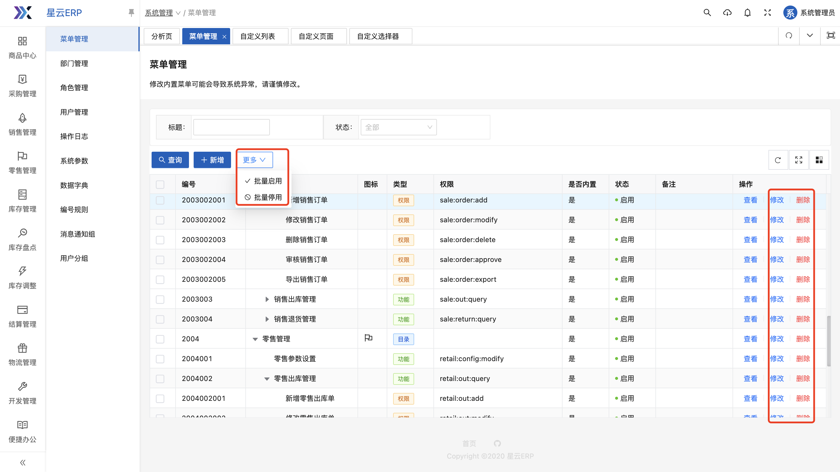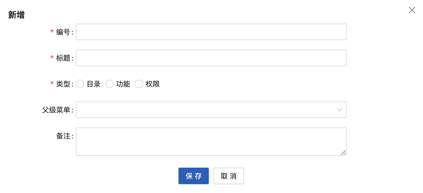 本功能用于设置星云ERP系统的“菜单”信息。 **菜单**是指集中提供操作系统或应用程序核心功能、设置和管理选项的菜单。 菜单可以是一个目录,也可以是一个具体的功能,同时,也可以是一个具体的操作。 **示例**  1. “系统管理”为一级菜单,类型为“目录”,点击后,展示该菜单的下级菜单列表。 2. “菜单管理”为二级菜单,类型为“功能”,点击后,系统打开“菜单管理”的页面,进一步可在该功能下进行具体的操作。 3. “新增”为操作按钮,类型为“权限”,点击后,系统打开“新增”弹窗,可进行新增“菜单”的操作。 可以看到,菜单分为多个类型,不同的类型对应不同的含义。星云ERP系统将菜单分为“目录、功能、权限”3个类型: 1. 类型为“目录” 是指该菜单为进入下级菜单的入口。如“系统管理”为“目录”类型的菜单,不是具体功能,更不执行具体的系统逻辑或业务场景,仅是作为入口。在菜单树形结构中,一般属于父级节点或一级节点。 2. 类型为“功能” 是指该菜单为具体业务功能或系统功能的入口,也可理解为:该菜单是为完成某个业务场景、系统逻辑的入口。如“菜单管理”为“功能”类型的菜单,是具体的系统功能,是要执行菜单管理业务的入口。在菜单树形结构中,属于末级以上的节点,但不是末级节点,因为,末级节点为类型为“权限”的菜单。 3. 类型为“权限” 是指该菜单为执行具体系统逻辑的入口,也可理解为:该菜单会执行具体的系统逻辑。如“新增”为“权限”类型的菜单,是具体的系统逻辑,执行后会为系统新增一个菜单。在菜单树形结构中,属于末级节点。 如图可以清晰得知,各类型菜单在整个菜单结构中的位置和作用。 **本功能使用场景** 修改系统已有菜单名称、菜单结构,以满足企业用户的使用习惯。或是新增菜单模块、新增功能,实现系统的快速开发,以满足企业新增业务的快速响应。 **本功能用户** 系统管理员或者具有开发能力的研发人员。 执行“菜单管理”功能时,可以看到,星云ERP系统中已“启用”的菜单结构(如下图所示):  ## 1.1新增 点击“新增”按钮,显示:  1. 编号:必填,唯一性。 2. 标题:菜单的名称,必填。 3. 类型:分为“目录、功能、权限”,根据新增菜单的应用场景进行勾选。 4. 父级菜单:菜单允许为多级,所以需要指定父级菜单或上级菜单。非必填,如果新增的菜单为一级菜单,则父级菜单不需要配置,如果新增的菜单为某一模块下的二级菜单或功能,则父级菜单需要配置,以实现正确的菜单结构。 5. 备注:菜单的补充说明信息。非必填。 **示例1** 新增“采购管理”模块,一级菜单为“采购管理”:  因为是一级菜单,且不是具体功能,不执行系统逻辑,仅为入口,所以类型为“目录”。 1. 图标:“采购管理”菜单前的小图标,不具有业务意义,以让系统看起来更美观。  2. 父级菜单:“采购管理”为一级菜单,因此不需要配置父级菜单。 3. 路由名称:对应路由当中的name属性。必填。 4. 路由路径:对应路由当中的path属性。如果需要内嵌iframe页面,那么此处填写值规则:路由地址/src=iframe地址,例如:/baidu?src=https://www.****.com 5. 是否隐藏:该菜单是否在系统中显示。 以上信息配置完毕后,点击“保存”按钮,即可完成“目录”类型的菜单新增。 **示例2** 在“采购管理”模块中,新增“采购订单管理”功能:  因为“采购订单管理”是要完成采购管理的业务,是具体功能,所以类型为“目录”。 1. 父级菜单:“采购订单管理”为“采购管理”下的二级菜单,因此需要配置父级菜单,且选择“采购管理”。 2. 权限:该菜单是否进行权限管理,如果管理,则需要配置为该菜单配置权限参数,以实现在“功能权限”配置时可以为用户进行授权此功能。 3. 路由名称:对应路由当中的name属性。必填。 4. 组件类型:分为“普通、自定义列表、自定义页面”。 (1)普通:表示是自己开发的组件。选择后,需要录入“组件”对应路由当中的component属性。  (2)自定义列表:表示是通过星云ERP系统“开发管理-自定义列表”配置出来的。选择后,需要选择一个“启用”状态的自定义列表。  (3)自定义页面:表示是通过星云ERP系统“开发管理-自定义页面”快速开发的页面。选择后,需要选择一个“启用”状态的自定义页面。  5. 路由路径:对应路由当中的path属性。如果需要内嵌iframe页面,那么此处填写值规则:路由地址/src=iframe地址,例如:/baidu?src=https://www.****.com 6. 是否不缓存:表示“采购订单管理”功能在切换页面是是否执行自动刷新操作。默认为“缓存”。可根据功能使用场景进行配置。 (1)如本功能为订单录入功能,在使用时经常遇到切换到其他功能查询数据等情况,因此,配置成“缓存”,这样避免在切换时自动刷新导致已录入未保存的数据自动清空。 (2)如本功能为参数配置功能,需要看到最新的配置信息,因此,切换页面需要自动刷新。因此,配置成“不缓存”。 7. 是否隐藏:该菜单是否在系统中显示。 以上信息配置完毕后,点击“保存”按钮,即可完成“功能”类型的菜单新增。 **示例3** 在“采购订单管理”功能中,增加“新增”操作:  因为“新增”操作是要进行采购订单录入,是具体的系统逻辑,所以类型为“权限”。 1. 父级菜单:“新增”为“采购订单管理”下的菜单,因此需要配置父级菜单,且选择“采购订单管理”。 2. 权限:该菜单是否进