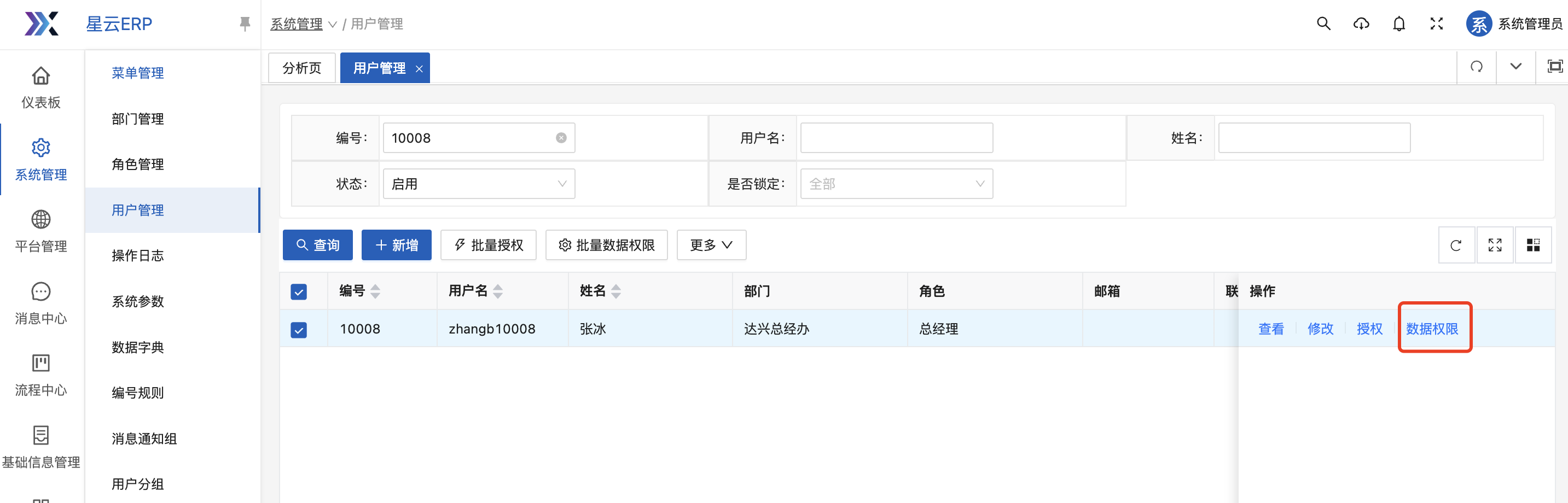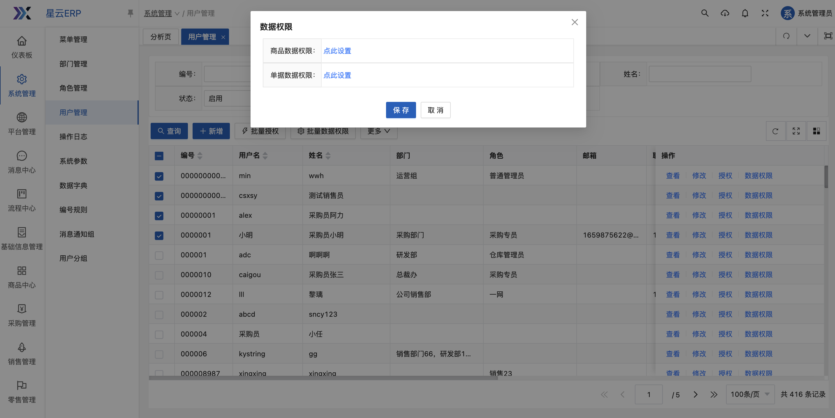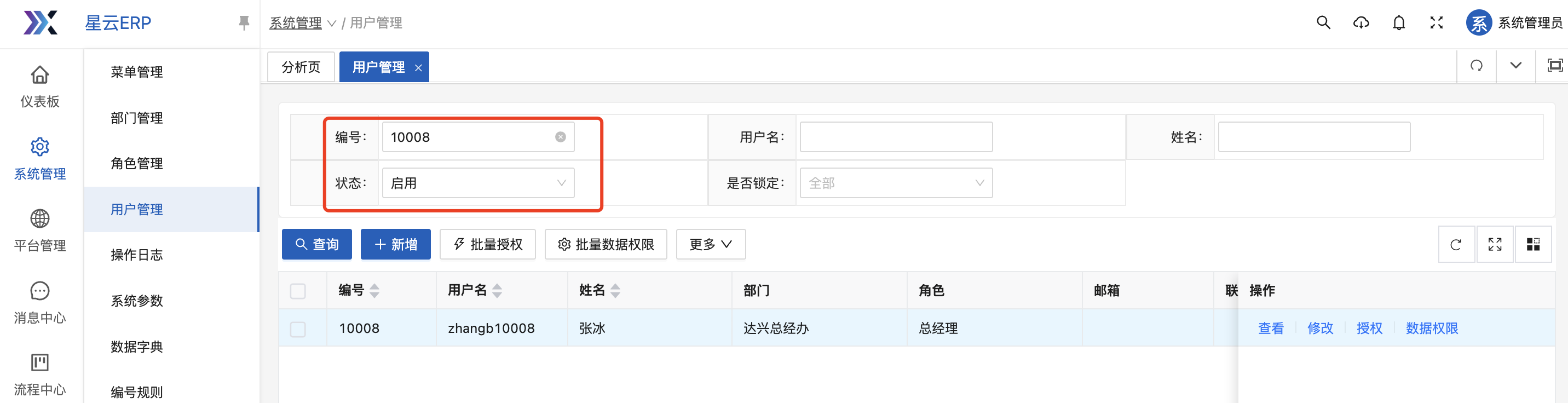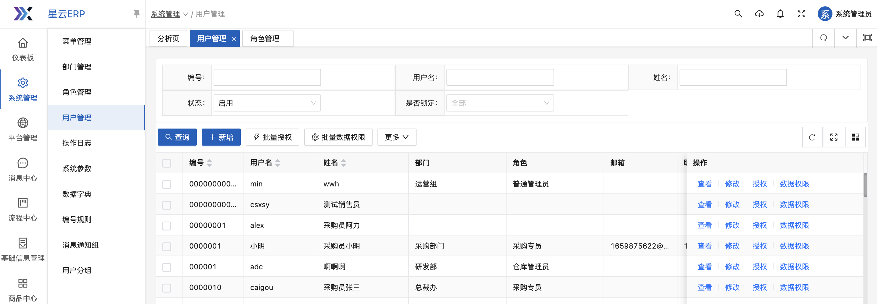 本功能用于设置星云ERP系统的“用户”信息。 **用户**是指允许登录系统的“人”。可以理解为:系统的登录账号和密码。该账号和密码可被某一个人使用,也可被一类人使用。 **系统的用户是谁?** 对于企业管理软件,系统的用户可分为“员工、临时用户”。 1. 员工 是指与本企业签订劳动合同,付出价值获取薪酬的自然人。在一定情况下,企业员工需要通过系统完成本职工作,因此,需要登录系统。系统管理员为员工建立账号和密码,员工获取后,就是系统的用户。该账号密码仅归对应员工使用。 2. 临时用户 是指临时访问系统但又对应企业员工的一个人或一类人。如企业在被第三方审计时,常常会为审计人员提供一个或多个临时账号,以供审计人员访问系统。 **系统的用户能在系统中做什么?** 创建系统用户时,需要指定“角色”,“角色”已设置好“功能权限和数据权限”,因此,用户的权限就是角色的权限,决定了:用户登录系统后能通过哪些功能对哪些数据进行操作。 星云ERP系统提供“用户管理”功能用于管理企业员工和临时用户。 ## 1.1用户管理 “达兴商贸有限公司”涉及很多部门很多员工,以每个部门的主要员工为实例,进行员工用户的录入。员工信息如下: | 序号 | 员工编号 | 员工姓名 | 用户名 | 角色 | | -| --- | --- | --- | --- | | 1 | 10008| 张冰 | zhangb10008 |总经理 | | 2 | 10009 | 左佑 | zuoy10009 |企业管理员 | | 3 | 10010 | 李茶 | lic10010 |采购总经理 | | 5 | 10011 | 王武 | wangw10011 |客户经理 | | 6 | 10012 | 赵元 | zhaoy10012 |零售经理 | | 7 | 10013 | 李品 | lip10013 |财务经理 | **关于员工编号** 是指在本企业中员工的唯一ID,因此,员工编号要由人力部门统一管理,且具有编号规则,建议:位数一致、从小到大生成,且编号开头不为“0”。 “达兴商贸有限公司”决定,员工编号采用开头为“1”的6位纯数字编号,从最小编号“10001”开始,新入职员工的编号依次递增。 **关于用户名** 是指用户登录系统的唯一ID,因此,用户名要由人力或系统管理员共同管理,且具有生成规则。 “达兴商贸有限公司”决定,用户名采用“员工姓的全拼+名的首字母+员工编号”的编号规则,既保证通过前缀可得知是哪位员工,又保证用户名的唯一性。 **关于初始密码** 是指用户登录系统的安全验证,因此,密码是由企业员工自行管理,但系统管理员在建立用户时需要为用户设置初始密码,否则用户将无法完成第一次登录。初始密码需要由人力或系统管理员共同管理,且具有生成规则。 “达兴商贸有限公司”决定,初始密码采用“员工姓名全拼+3位随机数”的规则,既保证统一规则,又保证密码安全性。 以上规则确定好后,点击“用户管理”菜单,进入功能:  ### 1.1.1新增用户 创建用户信息,点击“新增”按钮,如下所示:  1. 编号:用户编号,必填、唯一性。系统支持自动生成编号,同时,可以手动录入编号,方便自己管理。 2. 用户名:用户登录系统的账号,必填、唯一性。 3. 姓名:用户的姓名,即员工的真是姓名,必填。 4. 部门:用户所属的部门信息,非必填、可多选。如果员工任职多个部门,可根据实际情况选择。建议每个员工均要有所属部门,否则,影响数据权限中的订单权限。 5. 角色:用户的角色,决定用户的权限,即在系统中可以使用哪些功能操作哪些数据,非必填。建议每个用户均要有所属的角色,否则,无法访问系统。 6. 密码:用户登录系统的安全验证,必填。 7. 性别:用户的性别,分为“未知、男、女”。必填。 8. 邮箱:用户的电子邮箱,非必填。 9. 联系电话:用户的联系方式,如手机、固定电话等。非必填。 10. 备注:用户的补充说明信息。  以上为员工张冰录入用户信息,点击“保存”按钮,则生成张冰的用户信息。在张冰入职时,可将系统的账号密码同入职文件一并交给他。 重复以上操作,可为其他员工创建用户信息。 ### 1.1.2授权 创建好“用户”后,可以为该用户更改所属“角色”,以修改用户的权限,因为,角色决定了功能权限和数据权限。  点击该用户对应的“授权”按钮,所示如下:  选择角色后,点击“保存”按钮,则完成修改。 ### 1.1.3数据权限 创建好“角色”后,可以为该角色设置数据权限。  注:“角色管理”的规则中提到: 1. 非特殊情况下,不建议为“用户”直接设置权限,因为会导致设置繁琐、工作量大,同时权限管理将很乱。 2. 如果企业某员工需要增加、减少权限,说明他的工作内容有调整,建议为该员工在系统中新增一个角色。 3. 特殊情况下,某用户临时增加、减少权限,可为“用户”直接设置权限。到期后,要及时“从用户身上删掉”该权限。 “角色”决定了用户的功能权限和数据权限,如果再为用户设置数据权限,系统将取数据权限的并集,从而决定用户的数据权限。 在进行权限配置时,企业应坚守系统权限管理制度。 **操作介绍,但不建议使用!!!** 点击该用户对应的“数据权限”按钮,所示如下:  数据权限分为:商品数据权限、订单数据权限。 1. 商品数据权限 是指拥有该角色的用户可以查看到哪些商品数据。涉及商品数据权限的功能包括“商品管理、商品库存、商品库存变动记录、库存预警”等以商品为维度的业务功能。 配置商品权限,点击“点此设置”按钮,如下所示:  可通过“逻辑公式加商品属性”设置商品数据权限。步骤如下: * 第一步:光标选中某一运算逻辑,拖动到右侧虚线框中。