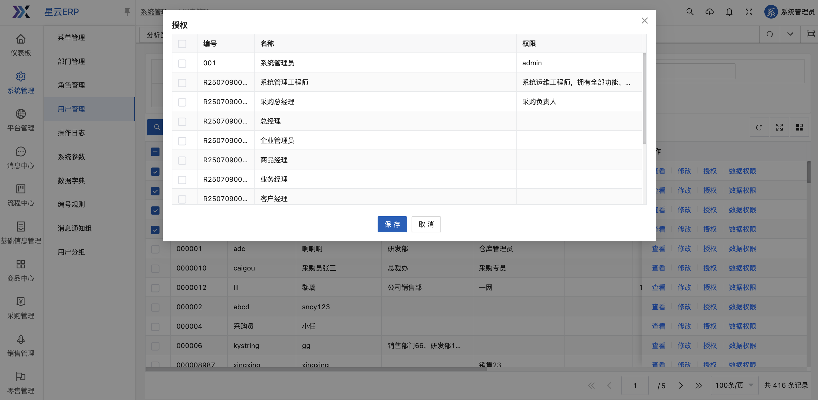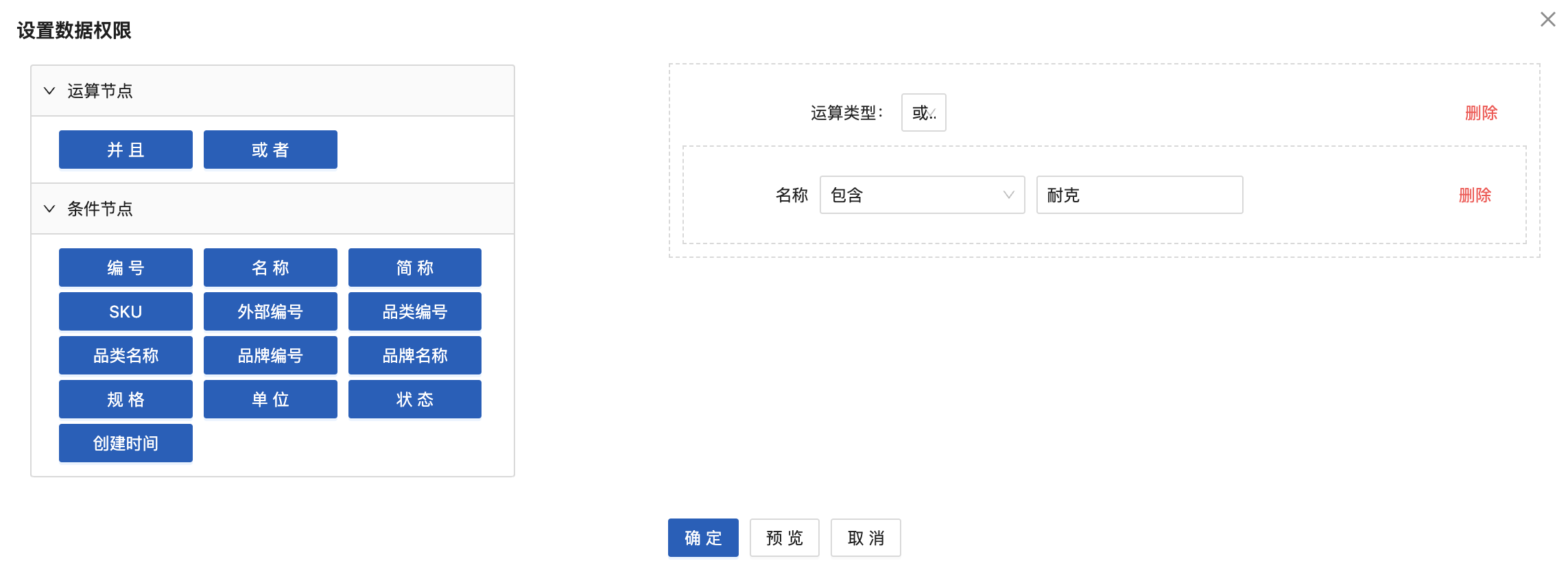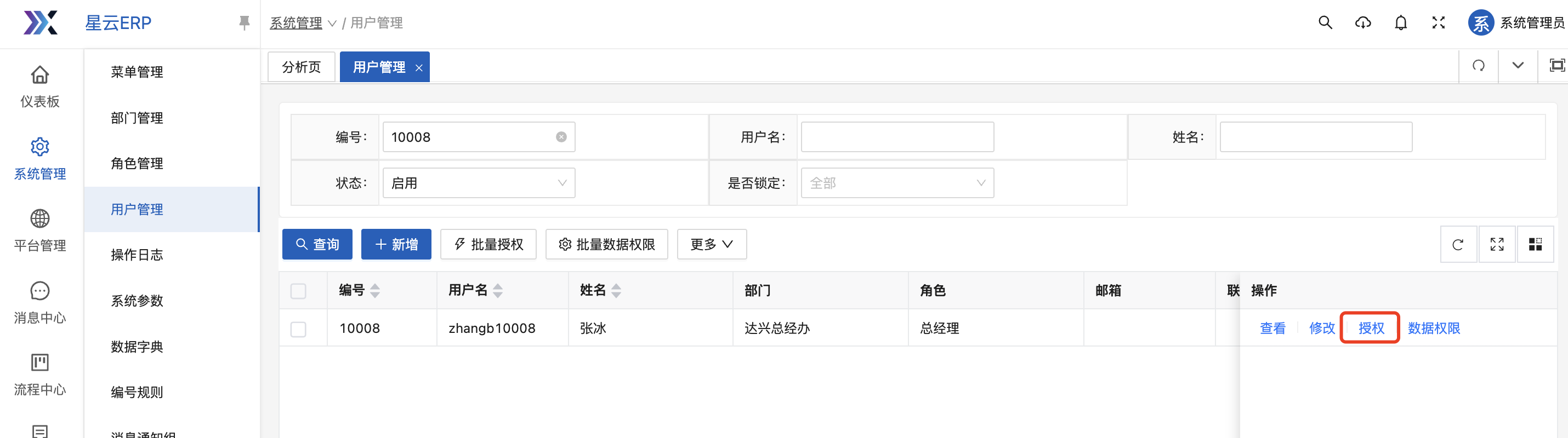 本功能用于设置星云ERP系统的“用户”信息。 **用户**是指允许登录系统的“人”。可以理解为:系统的登录账号和密码。该账号和密码可被某一个人使用,也可被一类人使用。 **系统的用户是谁?** 对于企业管理软件,系统的用户可分为“员工、临时用户”。 1. 员工 是指与本企业签订劳动合同,付出价值获取薪酬的自然人。在一定情况下,企业员工需要通过系统完成本职工作,因此,需要登录系统。系统管理员为员工建立账号和密码,员工获取后,就是系统的用户。该账号密码仅归对应员工使用。 2. 临时用户 是指临时访问系统但又对应企业员工的一个人或一类人。如企业在被第三方审计时,常常会为审计人员提供一个或多个临时账号,以供审计人员访问系统。 **系统的用户能在系统中做什么?** 创建系统用户时,需要指定“角色”,“角色”已设置好“功能权限和数据权限”,因此,用户的权限就是角色的权限,决定了:用户登录系统后能通过哪些功能对哪些数据进行操作。 星云ERP系统提供“用户管理”功能用于管理企业员工和临时用户。 ## 1.1用户管理 “达兴商贸有限公司”涉及很多部门很多员工,以每个部门的主要员工为实例,进行员工用户的录入。员工信息如下: | 序号 | 员工编号 | 员工姓名 | 用户名 | 角色 | | -| --- | --- | --- | --- | | 1 | 10008| 张冰 | zhangb10008 |总经理 | | 2 | 10009 | 左佑 | zuoy10009 |企业管理员 | | 3 | 10010 | 李茶 | lic10010 |采购总经理 | | 5 | 10011 | 王武 | wangw10011 |客户经理 | | 6 | 10012 | 赵元 | zhaoy10012 |零售经理 | | 7 | 10013 | 李品 | lip10013 |财务经理 | **关于员工编号** 是指在本企业中员工的唯一ID,因此,员工编号要由人力部门统一管理,且具有编号规则,建议:位数一致、从小到大生成,且编号开头不为“0”。 “达兴商贸有限公司”决定,员工编号采用开头为“1”的6位纯数字编号,从最小编号“10001”开始,新入职员工的编号依次递增。 **关于用户名** 是指用户登录系统的唯一ID,因此,用户名要由人力或系统管理员共同管理,且具有生成规则。 “达兴商贸有限公司”决定,用户名采用“员工姓的全拼+名的首字母+员工编号”的编号规则,既保证通过前缀可得知是哪位员工,又保证用户名的唯一性。 **关于初始密码** 是指用户登录系统的安全验证,因此,密码是由企业员工自行管理,但系统管理员在建立用户时需要为用户设置初始密码,否则用户将无法完成第一次登录。初始密码需要由人力或系统管理员共同管理,且具有生成规则。 “达兴商贸有限公司”决定,初始密码采用“员工姓名全拼+3位随机数”的规则,既保证统一规则,又保证密码安全性。 以上规则确定好后,点击“用户管理”菜单,进入功能:  ### 1.1.1新增用户 创建用户信息,点击“新增”按钮,如下所示:  1. 编号:用户编号,必填、唯一性。系统支持自动生成编号,同时,可以手动录入编号,方便自己管理。 2. 用户名:用户登录系统的账号,必填、唯一性。 3. 姓名:用户的姓名,即员工的真是姓名,必填。 4. 部门:用户所属的部门信息,非必填、可多选。如果员工任职多个部门,可根据实际情况选择。建议每个员工均要有所属部门,否则,影响数据权限中的订单权限。 5. 角色:用户的角色,决定用户的权限,即在系统中可以使用哪些功能操作哪些数据,非必填。建议每个用户均要有所属的角色,否则,无法访问系统。 6. 密码:用户登录系统的安全验证,必填。 7. 性别:用户的性别,分为“未知、男、女”。必填。 8. 邮箱:用户的电子邮箱,非必填。 9. 联系电话:用户的联系方式,如手机、固定电话等。非必填。 10. 备注:用户的补充说明信息。  以上为员工张冰录入用户信息,点击“保存”按钮,则生成张冰的用户信息。在张冰入职时,可将系统的账号密码同入职文件一并交给他。 重复以上操作,可为其他员工创建用户信息。 ### 1.1.2授权 创建好“用户”后,可以为该用户更改所属“角色”,以修改用户的权限,因为,角色决定了功能权限和数据权限。  点击该用户对应的“授权”按钮,所示如下:  选择角色后,点击“保存”按钮,则完成修改。 ### 1.1.3数据权限 创建好“角色”后,可以为该角色设置数据权限。  注:“角色管理”的规则中提到: 1. 非特殊情况下,不建议为“用户”直接设置权限,因为会导致设置繁琐、工作量大,同时权限管理将很乱。 2. 如果企业某员工需要增加、减少权限,说明他的工作内容有调整,建议为该员工在系统中新增一个角色。 3. 特殊情况下,某用户临时增加、减少权限,可为“用户”直接设置权限。到期后,要及时“从用户身上删掉”该权限。 “角色”决定了用户的功能权限和数据权限,如果再为用户设置数据权限,系统将取数据权限的并集,从而决定用户的数据权限。 在进行权限配置时,企业应坚守系统权限管理制度。 **操作介绍,但不建议使用!!!** 点击该用户对应的“数据权限”按钮,所示如下:  数据权限分为:商品数据权限、订单数据权限。 1. 商品数据权限 是指拥有该角色的用户可以查看到哪些商品数据。涉及商品数据权限的功能包括“商品管理、商品库存、商品库存变动记录、库存预警”等以商品为维度的业务功能。 配置商品权限,点击“点此设置”按钮,如下所示:  可通过“逻辑公式加商品属性”设置商品数据权限。步骤如下: * 第一步:光标选中某一运算逻辑,拖动到右侧虚线框中。