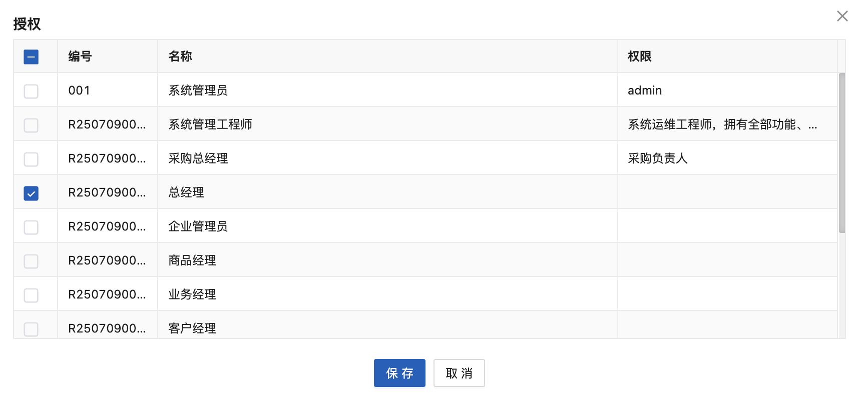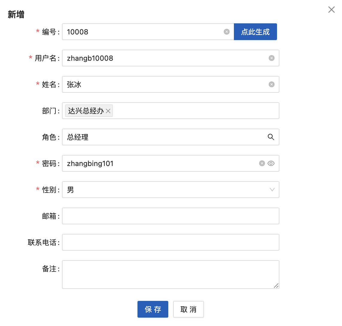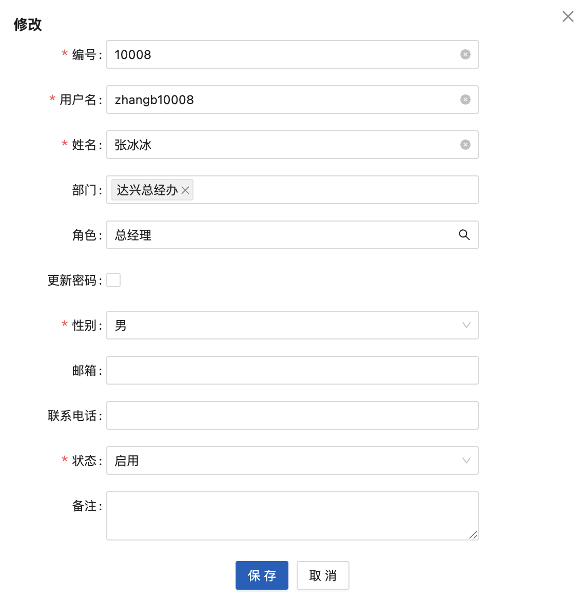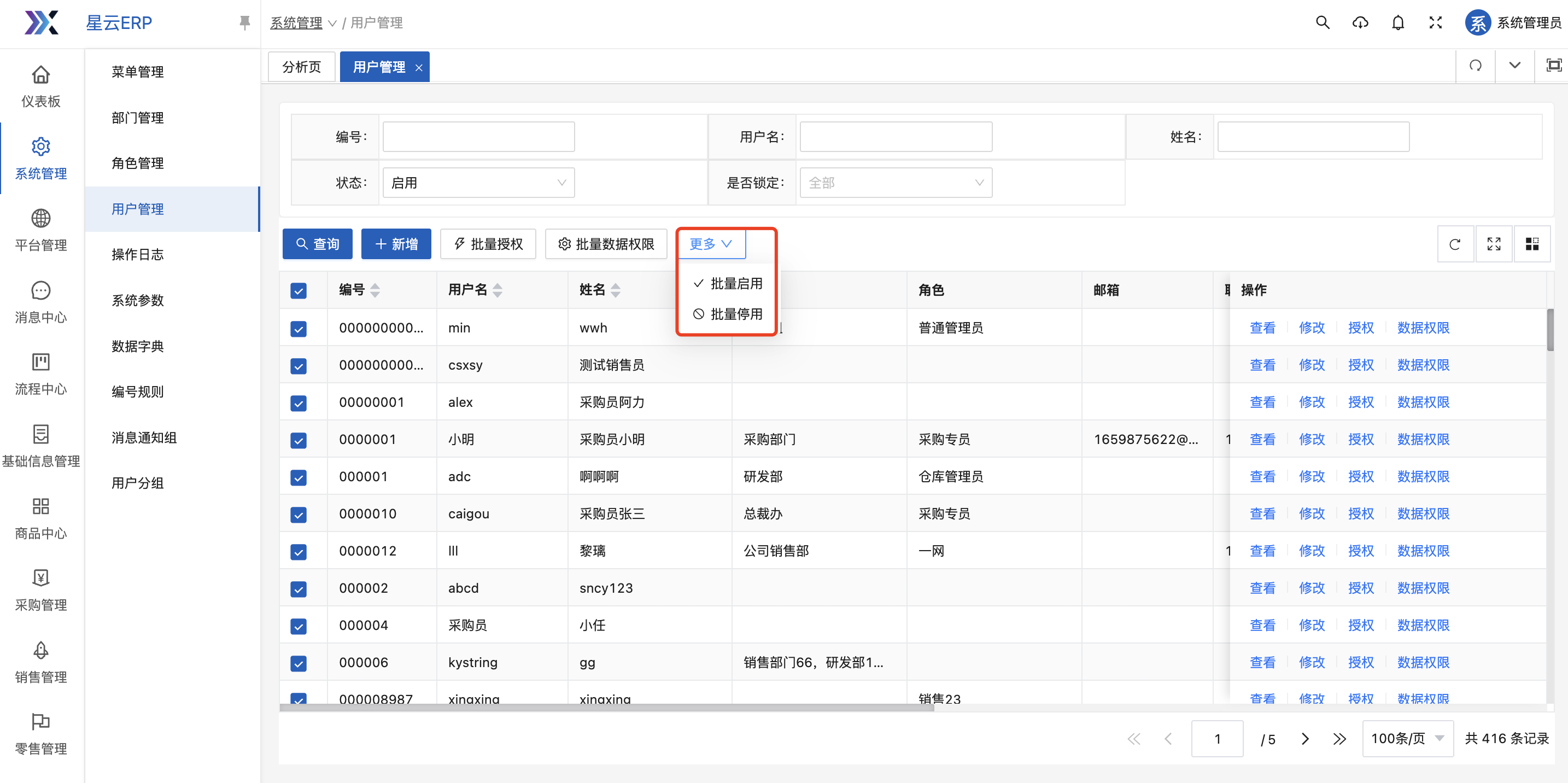 本功能用于设置星云ERP系统的“用户”信息。 **用户**是指允许登录系统的“人”。可以理解为:系统的登录账号和密码。该账号和密码可被某一个人使用,也可被一类人使用。 **系统的用户是谁?** 对于企业管理软件,系统的用户可分为“员工、临时用户”。 1. 员工 是指与本企业签订劳动合同,付出价值获取薪酬的自然人。在一定情况下,企业员工需要通过系统完成本职工作,因此,需要登录系统。系统管理员为员工建立账号和密码,员工获取后,就是系统的用户。该账号密码仅归对应员工使用。 2. 临时用户 是指临时访问系统但又对应企业员工的一个人或一类人。如企业在被第三方审计时,常常会为审计人员提供一个或多个临时账号,以供审计人员访问系统。 **系统的用户能在系统中做什么?** 创建系统用户时,需要指定“角色”,“角色”已设置好“功能权限和数据权限”,因此,用户的权限就是角色的权限,决定了:用户登录系统后能通过哪些功能对哪些数据进行操作。 星云ERP系统提供“用户管理”功能用于管理企业员工和临时用户。 ## 1.1用户管理 “达兴商贸有限公司”涉及很多部门很多员工,以每个部门的主要员工为实例,进行员工用户的录入。员工信息如下: | 序号 | 员工编号 | 员工姓名 | 用户名 | 角色 | | -| --- | --- | --- | --- | | 1 | 10008| 张冰 | zhangb10008 |总经理 | | 2 | 10009 | 左佑 | zuoy10009 |企业管理员 | | 3 | 10010 | 李茶 | lic10010 |采购总经理 | | 5 | 10011 | 王武 | wangw10011 |客户经理 | | 6 | 10012 | 赵元 | zhaoy10012 |零售经理 | | 7 | 10013 | 李品 | lip10013 |财务经理 | **关于员工编号** 是指在本企业中员工的唯一ID,因此,员工编号要由人力部门统一管理,且具有编号规则,建议:位数一致、从小到大生成,且编号开头不为“0”。 “达兴商贸有限公司”决定,员工编号采用开头为“1”的6位纯数字编号,从最小编号“10001”开始,新入职员工的编号依次递增。 **关于用户名** 是指用户登录系统的唯一ID,因此,用户名要由人力或系统管理员共同管理,且具有生成规则。 “达兴商贸有限公司”决定,用户名采用“员工姓的全拼+名的首字母+员工编号”的编号规则,既保证通过前缀可得知是哪位员工,又保证用户名的唯一性。 **关于初始密码** 是指用户登录系统的安全验证,因此,密码是由企业员工自行管理,但系统管理员在建立用户时需要为用户设置初始密码,否则用户将无法完成第一次登录。初始密码需要由人力或系统管理员共同管理,且具有生成规则。 “达兴商贸有限公司”决定,初始密码采用“员工姓名全拼+3位随机数”的规则,既保证统一规则,又保证密码安全性。 以上规则确定好后,点击“用户管理”菜单,进入功能:  ### 1.1.1新增用户 创建用户信息,点击“新增”按钮,如下所示:  1. 编号:用户编号,必填、唯一性。系统支持自动生成编号,同时,可以手动录入编号,方便自己管理。 2. 用户名:用户登录系统的账号,必填、唯一性。 3. 姓名:用户的姓名,即员工的真是姓名,必填。 4. 部门:用户所属的部门信息,非必填、可多选。如果员工任职多个部门,可根据实际情况选择。建议每个员工均要有所属部门,否则,影响数据权限中的订单权限。 5. 角色:用户的角色,决定用户的权限,即在系统中可以使用哪些功能操作哪些数据,非必填。建议每个用户均要有所属的角色,否则,无法访问系统。 6. 密码:用户登录系统的安全验证,必填。 7. 性别:用户的性别,分为“未知、男、女”。必填。 8. 邮箱:用户的电子邮箱,非必填。 9. 联系电话:用户的联系方式,如手机、固定电话等。非必填。 10. 备注:用户的补充说明信息。  以上为员工张冰录入用户信息,点击“保存”按钮,则生成张冰的用户信息。在张冰入职时,可将系统的账号密码同入职文件一并交给他。 重复以上操作,可为其他员工创建用户信息。 ### 1.1.2授权 创建好“用户”后,可以为该用户更改所属“角色”,以修改用户的权限,因为,角色决定了功能权限和数据权限。  点击该用户对应的“授权”按钮,所示如下:  选择角色后,点击“保存”按钮,则完成修改。 ### 1.1.3数据权限 创建好“角色”后,可以为该角色设置数据权限。  注:“角色管理”的规则中提到: 1. 非特殊情况下,不建议为“用户”直接设置权限,因为会导致设置繁琐、工作量大,同时权限管理将很乱。 2. 如果企业某员工需要增加、减少权限,说明他的工作内容有调整,建议为该员工在系统中新增一个角色。 3. 特殊情况下,某用户临时增加、减少权限,可为“用户”直接设置权限。到期后,要及时“从用户身上删掉”该权限。 “角色”决定了用户的功能权限和数据权限,如果再为用户设置数据权限,系统将取数据权限的并集,从而决定用户的数据权限。 在进行权限配置时,企业应坚守系统权限管理制度。 **操作介绍,但不建议使用!!!** 点击该用户对应的“数据权限”按钮,所示如下:  数据权限分为:商品数据权限、订单数据权限。 1. 商品数据权限 是指拥有该角色的用户可以查看到哪些商品数据。涉及商品数据权限的功能包括“商品管理、商品库存、商品库存变动记录、库存预警”等以商品为维度的业务功能。 配置商品权限,点击“点此设置”按钮,如下所示:  可通过“逻辑公式加商品属性”设置商品数据权限。步骤如下: * 第一步:光标选中某一运算逻辑,拖动到右侧虚线框中。