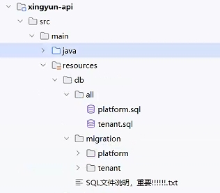 ### 如何初始化数据库 下载源码后,使用IDE工具打开后端项目源码。数据库脚本就在xingyun-api的**src/main/resources/db**目录中,如下图所示:  #### all目录 存放的是全量SQL脚本。 其中: * platform.sql:平台库SQL。 * tenant.sql:租户库SQL。 ==如果开启了多租户,那么平台库SQL是在平台库中执行,租户库SQL在租户库中执行。== ==如果没有开启多租户,那么这两个SQL脚本在同一个库中执行。== #### migration目录 存放的是增量SQL脚本。增量SQL主要是为了后续升级。 其中: * platform:平台库的增量SQL。 * tenant:租户库的增量SQL。 例如:部署好系统后,你可以记录下platform和tenant这两个目录下最大版本的SQL是多少。后续系统升级后,再看一下新拉取的代码中增量SQL是不是比之前要多,如果多了,说明有数据库变动,那么只需要将比之前记录的版本大的SQL脚本执行一下就可以了。 ==增量SQL中会包含处理历史数据的SQL,所以无需担心升级后历史数据会出现问题的情况。==